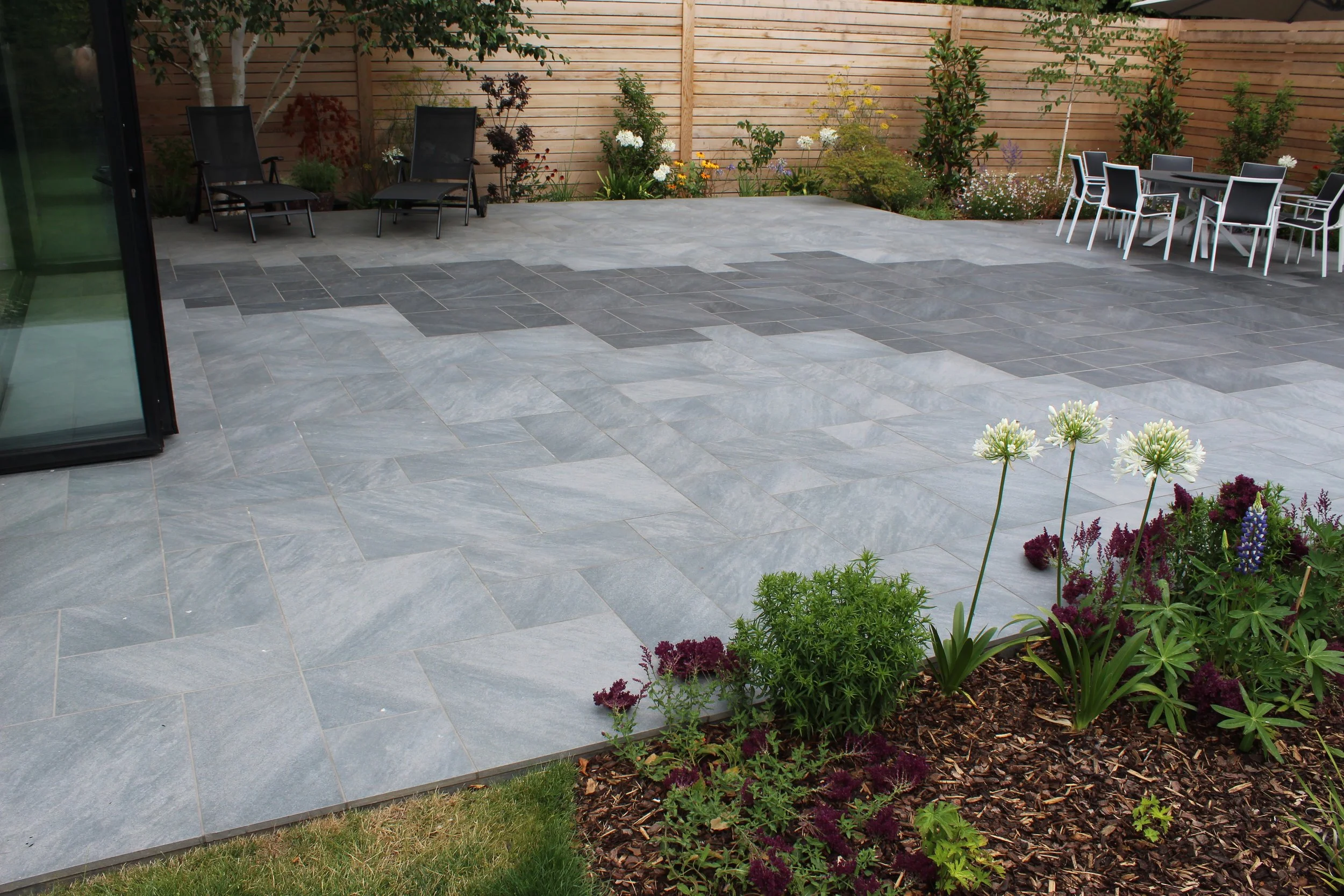 The homeowners wanted a low-maintenance garden with a large porcelain patio area, new pathways, and planting that would soften the space while keeping a contemporary feel.